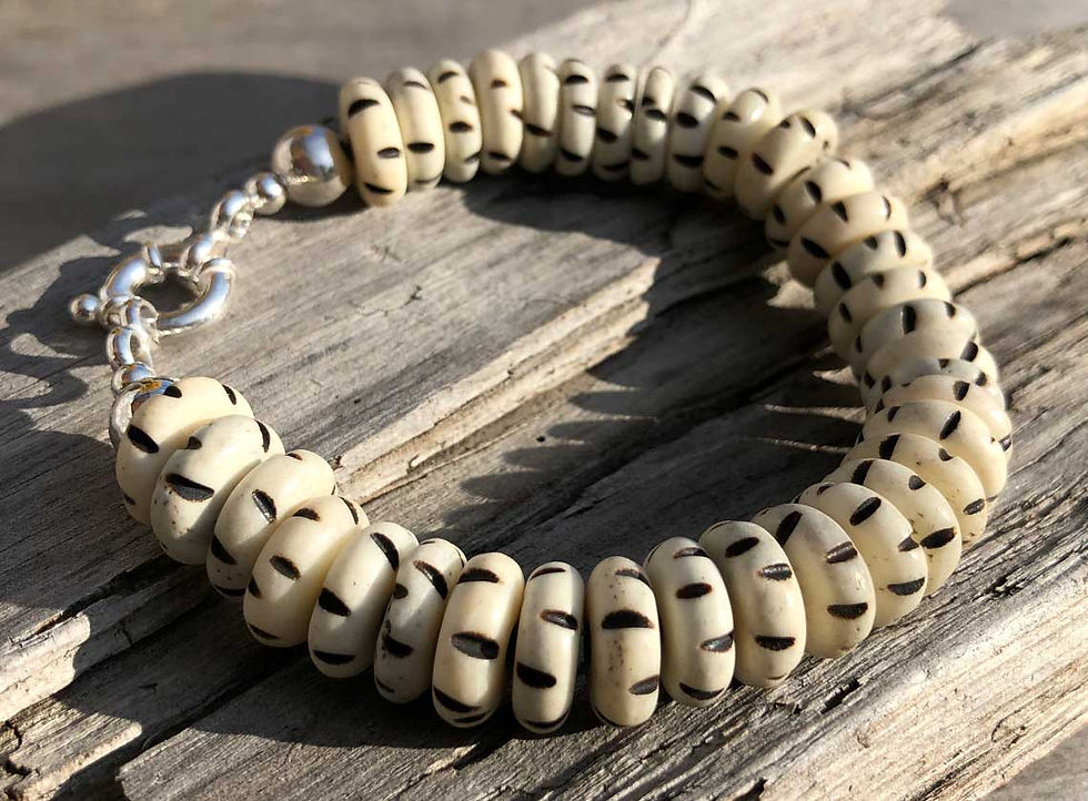 Armband "White Carved Disk Bone & Marbiney Seeds"